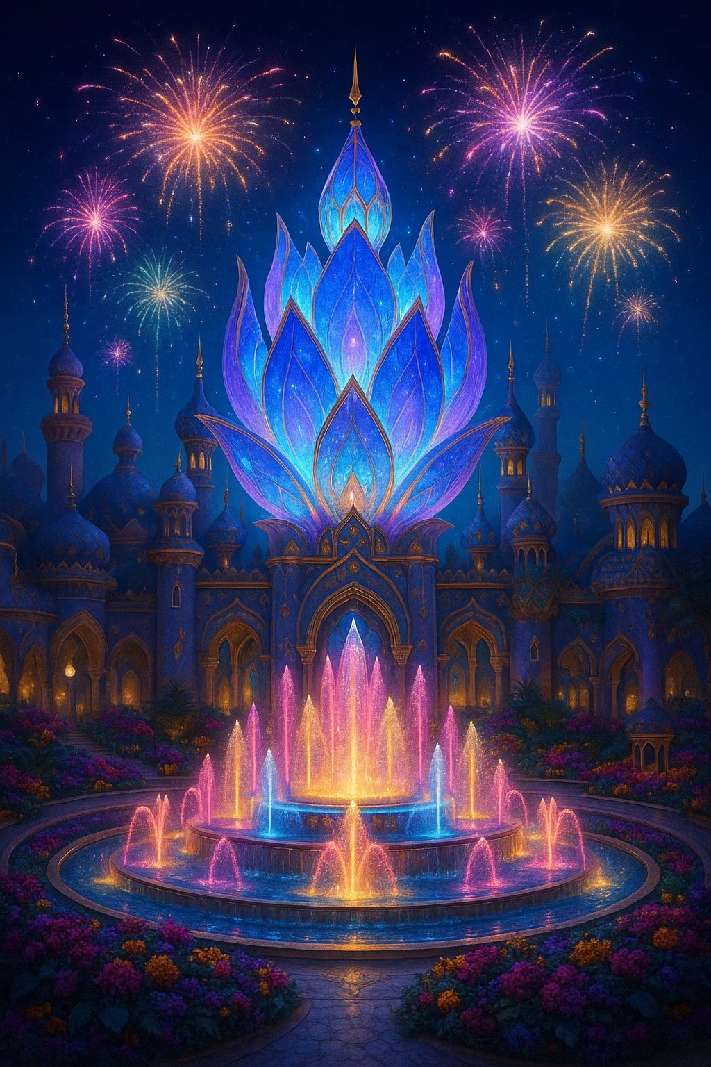 Rising like a beacon of enchantment at the heart of the theme park, the Crystal Crown is a majestic icon sculpted in the form of a colossal, glowing lotus. Radiating vibrant hues of blue, violet, and gold, this awe-inspiring structure appears to bloom with light itself, shimmering by day and glowing from within by night. Inspired by Arabian fairytales, celestial myths, and the natural elegance of the lotus flower, the Crystal Crown is the soul of the park’s wonder.